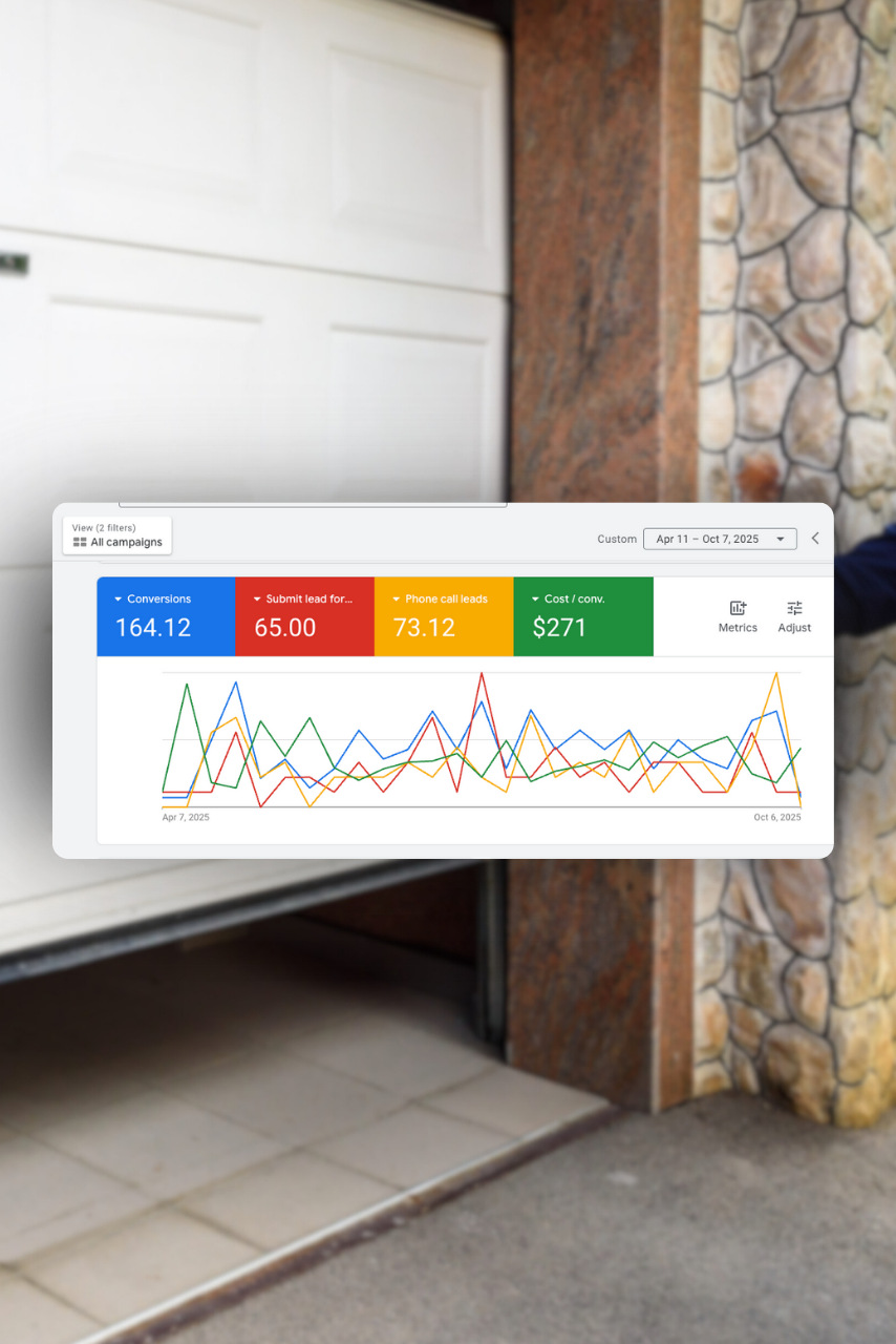 In the past 180 days, we helped a local garage door company generate 164 high-quality leads, including 73 phone calls and 65 form submissions, with an average cost per conversion of $271 through our Google Ads campaigns.