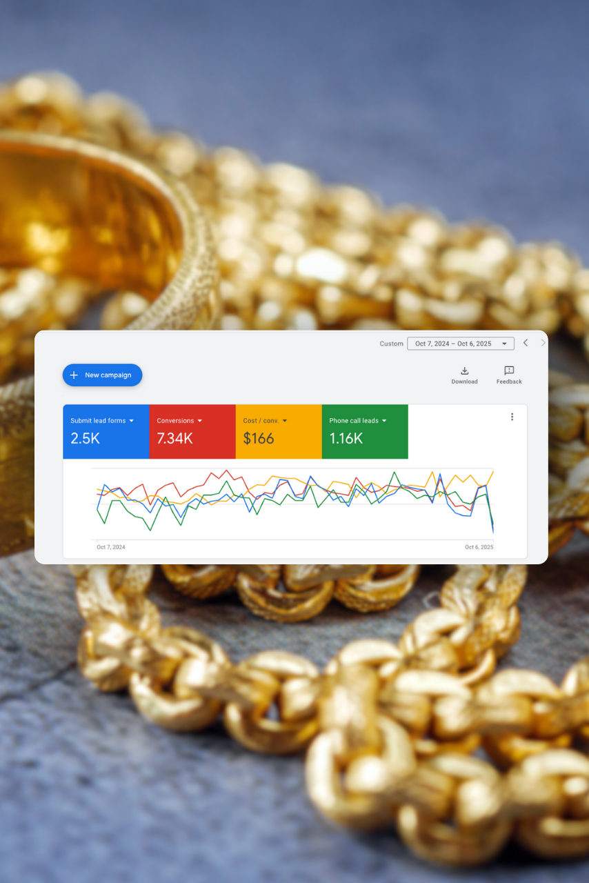 For a USA-based gold and jewelry buyer, we generated 7,344 qualified leads with an average cost per conversion of $166, driving results from a total ad spend of $1.22M through Google Ads…
